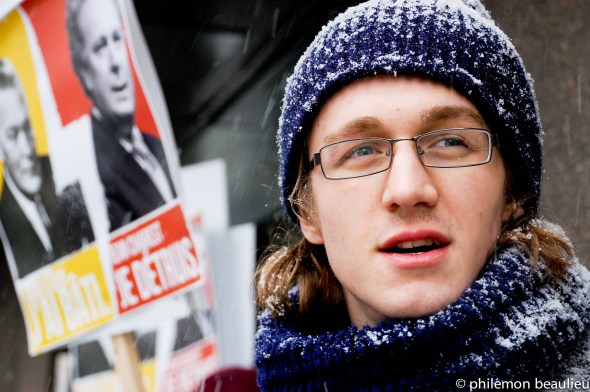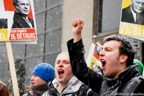 Il y a de cela quelques semaines, plus précisément le 25 février, se tenait une petite manifestation organisé par la coalition régionale des étudiants de Montréal. La manifestation se tenait pour dénoncer la hausse des frais de scolarité qui a finalement été annoncé dans le dernier budget provincial, hausse qui se chiffrera à 325$ sur 5 ans. La manifestation s’est tenue devant le centre Sheraton parce que Jean Charest y était pour faire une allocution devant la chambre de commerce du Montréal Métropolitain.