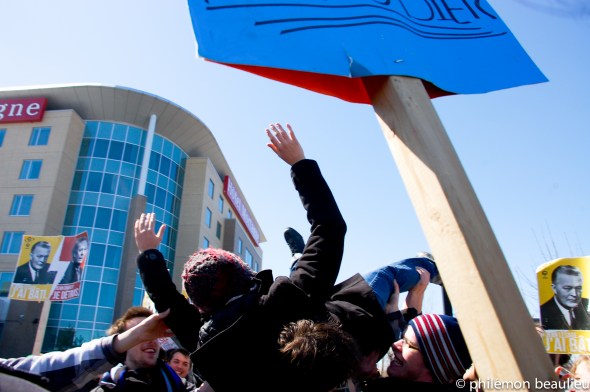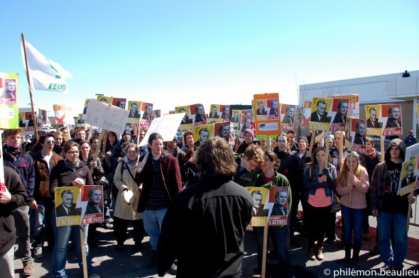 Aujourd’hui, 3 avril 2011, environ une centaine d’étudiants sont allé déranger les libéraux du Québec réunis en colloque à Boucherville. Nous avons scandé pendant environ une heure des slogans contre la hausse des frais de scolarité.