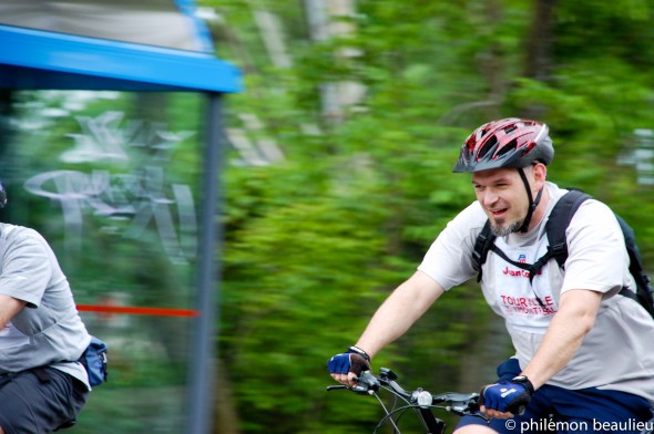 Aujourd’hui, j’ai eu la chance d’être bénévélo pour le tour de l’île. On m’avait assigné dans les environs de la croisée du boulevard Lasalle et du Canal de l’aqueduc. J’avais amené mon appareil photo avec moi. J’en ai donc profité pour faire quelques photos des cyclistes ainsi que de mon environnement.