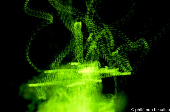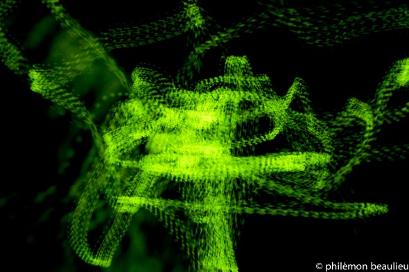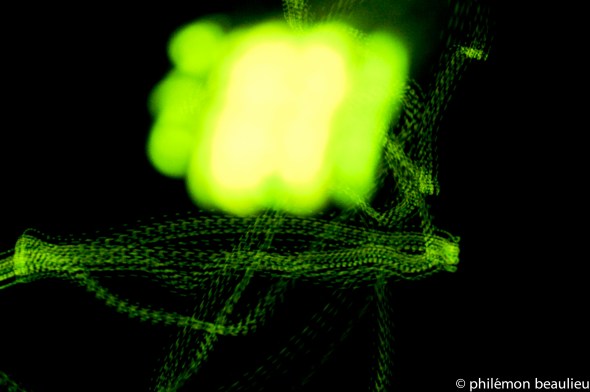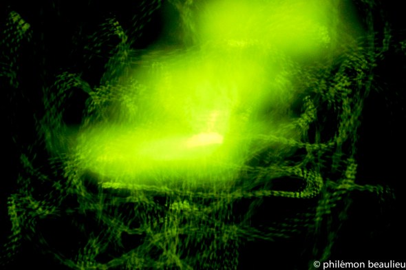 Hier, j’avais de la misère à m’endormir. En fait, je trouvais que mon cadran faisait trop de lumière. J’ai donc décidé de prendre en photo un toutou panda qui se trouvait pas très loin de mon lit tout en gardant la lumière fermée, espérant qu’il y a aurait assez de lumières provenant de mon cadran pour le voir apparaître dans ma photo. Bien sûr, il n’y avait pas assez de lumière pour ma photo. J’ai donc décidé de prendre en photo mon cadran. J’ai mis mon exposition à 30 secondes. Me rendant compte que la photo allait probablement être bougée, j’ai baissé la caméra, ce qui a tout naturellement fait une trainée lumineuse. Étant du genre à apprécier ce genre de photos, je me suis amusé à fond en faisant des mouvements de caméra. Voici les photos.