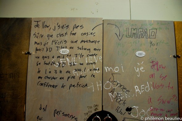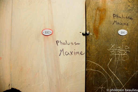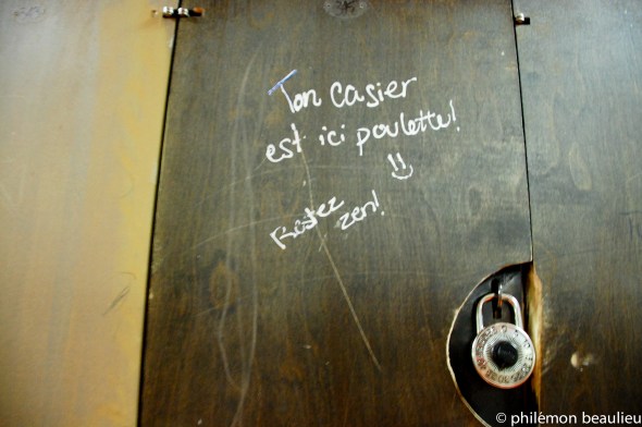 Par la suite, un des éléments loufoque au Cégep de Jonquière, c’est que les gens écrivent des messages parfois insignifiant, parfois bourré de fautes, sur les portes des casiers.
