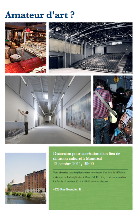 En gros, je vous invite à venir discuter de la possible création d’un lieu de diffusion artistique multidisciplinaire à Montréal (ou ailleurs tout dépendant).