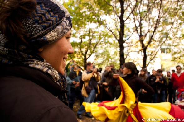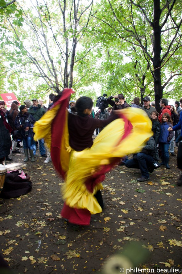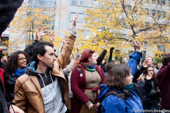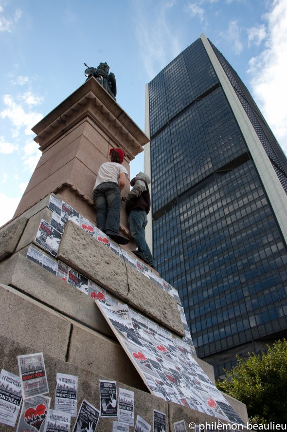 15 octobre 2011, des milliers de personne dans le monde décident de se soulever contre le système économique mondial en soutien avec le mouvement « Occupy Wall Street ». Les habitants de Montréal n’étaient pas en reste. Pour ce faire, quelques milliers de personnes se sont rendus au Square-Victoria dans le but de l’occuper indéfiniment. Une des premières actions votés par l’assemblée générale de l’occupation fut de renommer le Square-Victoria en place du peuple.